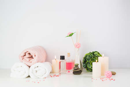 Spa and beauty treatment concept with towel, soap and candle. Flat lay composition