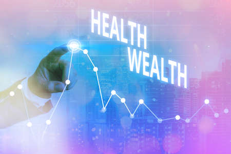 Word writing text Health Wealth. Business photo showcasing healthy mind and body can bring you wealth and happiness Arrow symbol going upward denoting points showing significant achievement