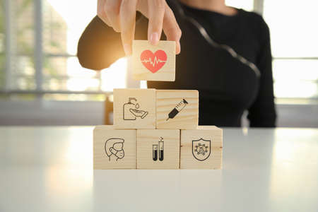 Good health care life insurance medical treatment along with quality of life Plus symbol and medical wooden block with icons healthcare, investment, retirement ideas for technology innovation medicine