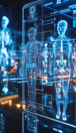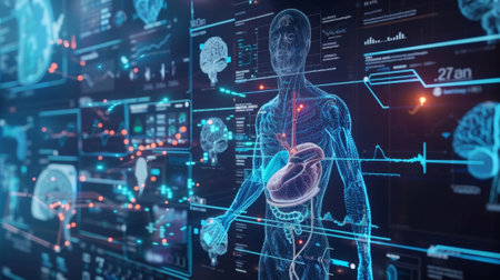 Futuristic medical technology analyzing human body data on digital display