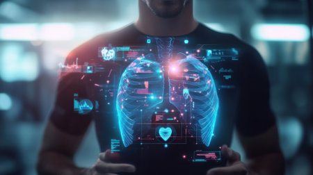 Doctor using futuristic interface analyzing lungs and heart health in augmented reality