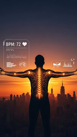 Digital illustration of a human figure with illuminated nervous system, arms outstretched over a cityscape at dusk. Features BPM monitor overlay, representing health, technology, and urban life integration in a futuristic concept.