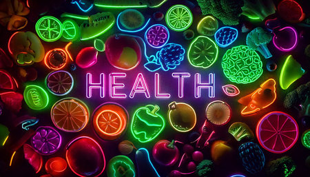 Bright neon fruits and vegetables are displayed with the word health illuminated in the center.