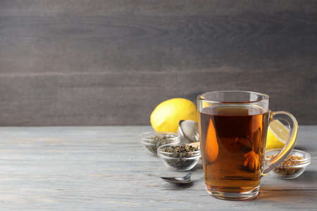 Natural herbal remedy for cold and flu. Composition with tea and warm plaid on wooden table.