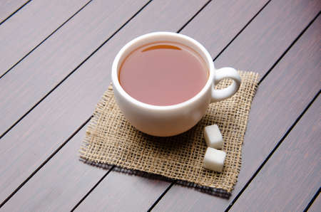 Hot tea is in the cup. Placed on a wooden tray. For a moment of rest of the day.