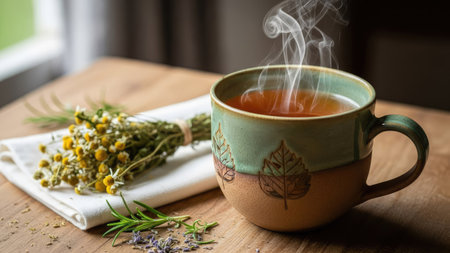A handmade ceramic mug with a hand-painted floral design, filled with steaming herbal tea, sitting on a wooden table surrounded