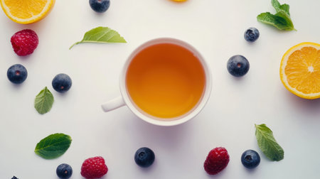 Explore a cozy setting featuring a cup of herbal tea surrounded by lush greenery and natural ingredients, perfect for health enthusiasts seeking wellness and relaxation.