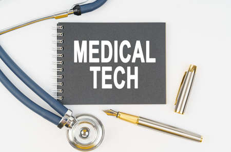 Medicine and health. On a white background lie a stethoscope, a pen and a notebook with the inscription - MEDICAL TECH