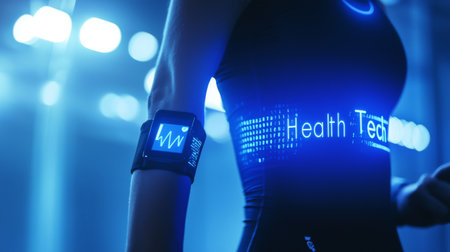 Close-up of a fitness tracker on an arm with a glowing health tech display