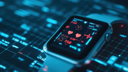 Close-up of a smartwatch showcasing health monitoring features, including heart rate and vital stats, against a striking digital interface for modern health awareness.