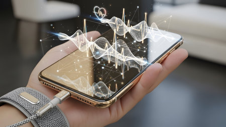 Network showing gold smartphone displaying glowing heart rate waveform and network connections...