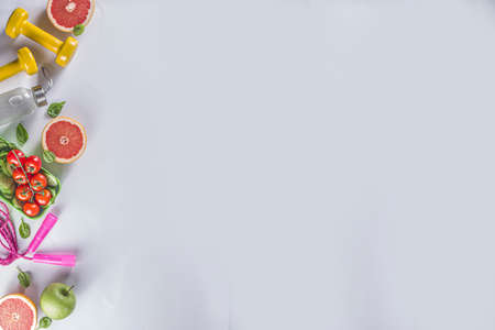 Fitness and healthy food lifestyle concept. Dumbbells, diet fruit and vegetable lunch box, water and jump rope on white background. Flatlay image, top view copy space