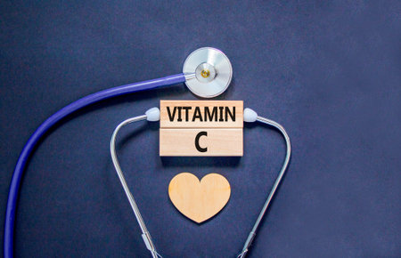 Vitamin C symbol. Concept words Vitamin C on beautiful wooden blocks. Wooden heart and stethoscope. Beautiful black background. Medical healthy lifestyle Vitamin C concept.