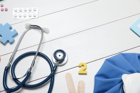 Pediatrics concept. Toys, stethoscope and pills on white wooden background, closeup. Space for text