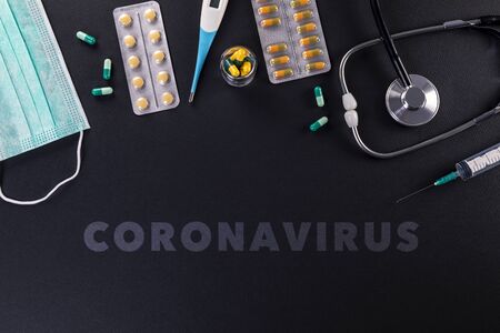 Protective masks, medicines, thermometer, stethoscope and syringe with coronavirus text on a black background. Novel coronavirus 2019-nCoV, MERS-Cov middle East respiratory syndrome coronavirus.