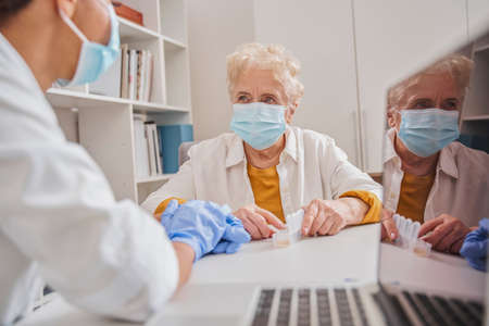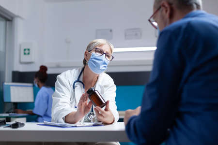 Physician showing bottle of pills to give to old patient during covid 19 pandemic. Doctor giving jar with prescription treatment and medicine to senior man with disease wearing face mask.