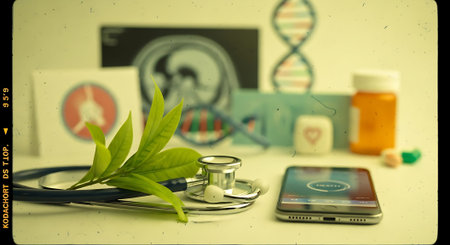 A stethoscope, smartphone, green leaf, and prescription bottle on a white surface with medical-themed decorations in the background.