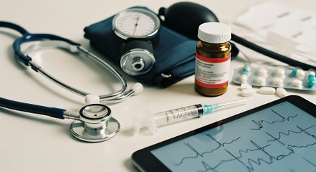 A top view of various medical supplies including a stethoscope, syringe, vials, and tablets arranged neatly on a textured grey surface.
