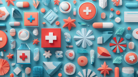 A vibrant flat lay of colorful medical and health-themed icons arranged on a bright blue background. This playful composition showcases various shapes and symbols in a creative design.