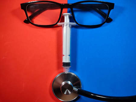 stethoscope and empty syringes lie on the table against a blue background
