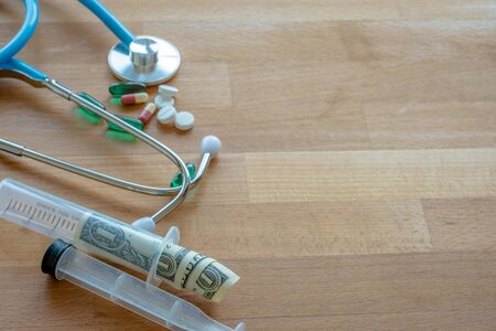 A dollar bill and stethoscope with syringe is inserted into the bill. The concept is the fall of the economy. Inflation, covid-19 pandemic