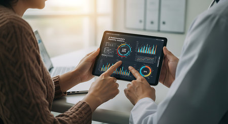 A modern tablet displays patient data and medical analytics in a clinical setting, showcasing advanced healthcare technology and digital innovation.