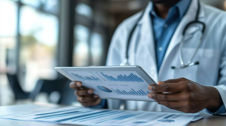 Reviewing doctor in scrubs with stethoscope examining charts in clinic, with candlestick graph. Medical, analytics, professional, financial, consulting, data, healthcare