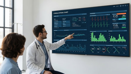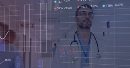 Consulting doctor with stethoscope in clinic showing line chart overlay with gridlines, percentages. Medical, healthcare, data visualization, professionalism, diagnosis, analytics, examination