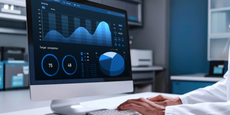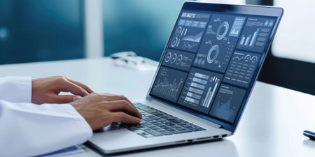 A focused medical professional analyzes critical healthcare data on multiple screens, showcasing intricate charts and graphs in a modern clinical environment.