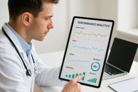 Doctor pointing at activity analytics displayed on a digital tablet, focusing on performance data and healthcare monitoring