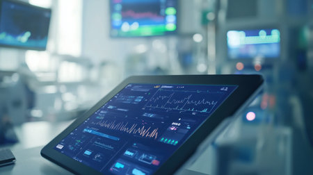 A modern digital tablet showcases vital signs and data analytics in a high-tech healthcare facility, emphasizing the role of technology in patient monitoring and care.