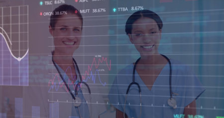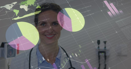 Image of financial data over happy caucasian female doctor. finance, economy, medicine, health and technology concept digitally generated image.