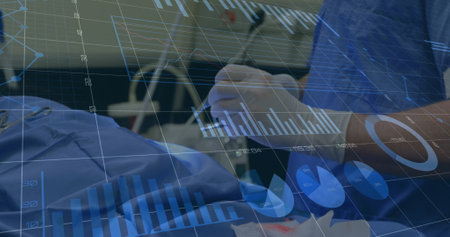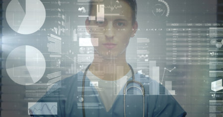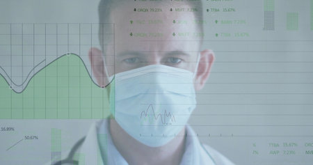 Image of statistics and data processing over caucasian male surgeon. Global medicine, connections, computing and data processing concept digitally generated image.