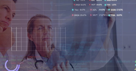 Image of financial graphs over thoughtful caucasian male and female doctor. Health, medicine, finance and economy concept digitally generated image.