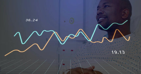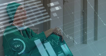Smiling doctor in surgical scrubs examining numeric codes and waveforms overlay in surgical suite. Medical, professional, healthcare, technology, analysis, diagnostics, futuristic
