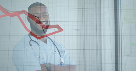 Smiling doctor wearing scrubs and stethoscope in clinic behind panel, with descending red chart. Medical, healthcare, professionalism, diagnostics, innovation, analysis, technology