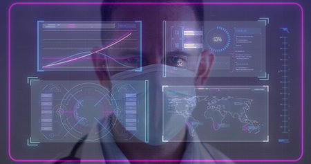 Analyzing scientist wearing protective mask and lab coat reviewing holographic data displays in lab. Futuristic, technology, innovation, visualization, analytics, digital, corporate
