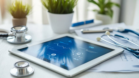 Advanced medical technology display with digital health metrics, stethoscope, and vital sign readings on a tablet device in a clinical setting