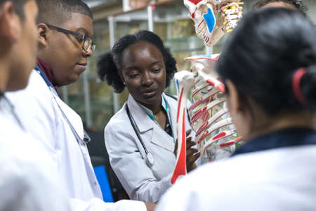 doctors of mixed race, of different sexes, in the study room, study human anatomy, on the skeleton. Young medical students at medical university