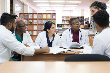 young doctors, mixed race. They sit at the table, solve medical problems. People of different sexes, in white coats, medical clothes, are sitting at a table in the office of the hospital