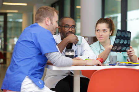 Young doctor stands by the window with an X-ray. Two colleagues of the doctors sit at the table and watch the young doctor. Concept of team medical work.