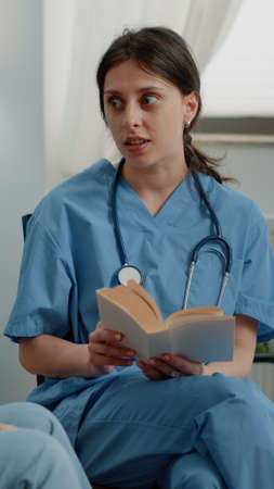 Medical assistant reading book for elder disabled woman in nursing home. Senior patient sitting in wheelchair receiving assistance and support from nurse as entertainment and fun activity.