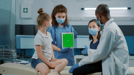 Woman nurse analyzing digital tablet with green screen and doctor explains diagnosis. Assistant holding chroma key background with isolated mockup template and blank copy space during pandemic.