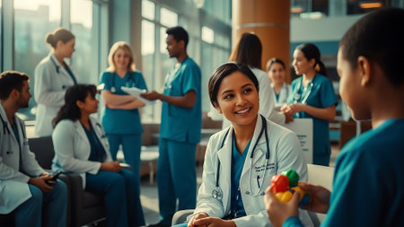 A female doctor in a white coat and blue scrubs smiles while reading with a young girl in a hospital lobby, surrounded by medical staff sitting on benches in the background.