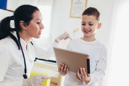 Female doctor explaining about the treatment on digital tablet for man patient.