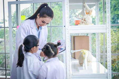doctors, mixed race, in the classroom, at a medical conference. Young people, in white coats, with stethoscopes, are studying medicine. Classroom, anatomical museum. Students raise their hand to answer the question of the teacher, professor