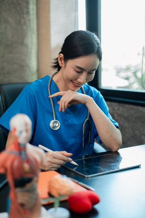 A female doctor in blue scrubs uses a digital tablet in a modern medical office, with anatomical models and a heart on the desk.