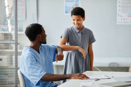 Portrait of smiling African-American girl bumping elbows with doctor at child vaccination clinic, copy space