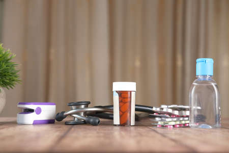 Collection of equipment medicine on the doctor's desktop. Medical concept.