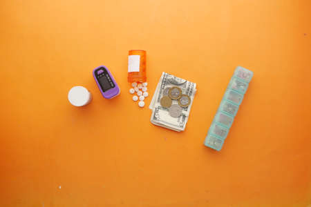 Stack of cash dollars and medical mask sanitizer antiseptic. The concept of medical expensive medicine. Copy space for text. Health Life insurance. vaccination costs. Covid-19 crimes